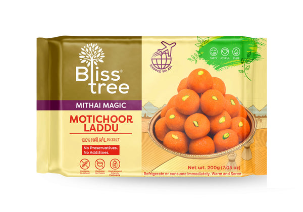Indulge in pure bliss with Bliss Tree's Motichoor Laddu - the epitome of traditional Indian sweets. Crafted with care, each laddu is freshly airlifted to retain its authentic flavors without any preservatives or additives. Our new, elegant packaging makes it the perfect gift for your loved ones. Simply warm and savor these melt-in-your-mouth delights, declared as the best sweets in town. Taste the tradition, taste the perfection with Bliss Tree Motichoor Laddu today!