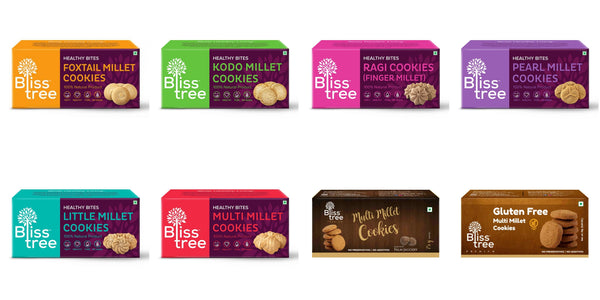 Package contains 8 packs 75g each - 1 x Foxtail Cookies, 1 x Kodo Cookies, 1 x Little Cookies, 1 x Multi-Millet Cookies, 1 x Ragi Cookies, 1 x Pearl Cookies, 1 x Palm Jaggery Cookies & 1 x Gluten-free Cookies.